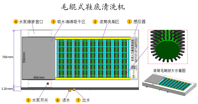 如圖中箭頭所示,使用人員從感應(yīng)器一方通過(guò),在清潔區(qū)域站立停留2- 3秒,此時(shí)刷浸水循環(huán)自行清潔并清潔鞋底;再通過(guò)吸干區(qū)停留1- 2秒經(jīng)過(guò)強(qiáng)力吸水棉,把鞋底水漬吸干后走下設(shè)備,完成整個(gè)清洗過(guò)程。如停留時(shí)間適當(dāng)增加,清潔效果更好。(如果置于風(fēng)淋室內(nèi),則不影響進(jìn)入時(shí)間,因風(fēng)淋室風(fēng)淋時(shí)間一般在10秒左右)。